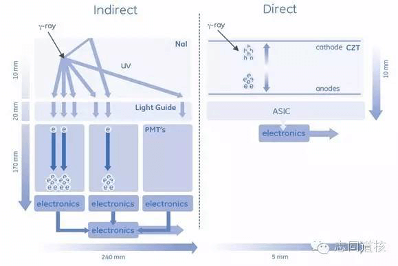 自从1958 年第一台Anger伽玛相机的诞生以来,传统的SPECT核医学设备探测器一直采用的是碘化钠晶体(NaI)+ 光电倍增管(PMT)设计(如上图左边),注射到人体内的放射性药物发射出γ光子,通过准直器定位投射到NaI晶体上,转换成可见光,再通过PMT光电倍增管进行光电转换成电信号并放大,传输到电子线路和工作站进行重建成像。这种多次转换的间接成像技术会导致大量的光子丢失,而PMT将可见光转化为电信号的效率也只有20%~25%左右,因此,传统的SPECT核医学设备在计数率、分辨率方面大受限制。